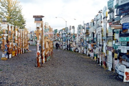 We packed up camp and continued north to the Yukon border passing through a number of recently burned off areas. There were many mushroom pickers and buyers set up in the burned areas. Pine mushrooms and morels fetch a good price on the international market and some pickers can make $2-300/ day. I had worked on the road crew through this section of highway in the early ’80s, however, there has been much upgrading and the road is now widened and paved. Once we reached the Alaska Highway we detoured the 15 miles into Watson Lake. The local claim to fame here is the prominent display of signs from all over the world. A carry over from the 1940s when homesick highway construction workers placed a few signs on a post to remind them of home, there are now an estimated 10,000 signs displayed from all over the globe.